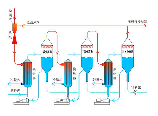 三效蒸發(fā)器主要由相互串聯的蒸發(fā)器、冷凝器、鹽分離器以及復制設備等組成三組蒸發(fā)器,以串聯的形式組成一整套的三效蒸發(fā)系統(tǒng)。
